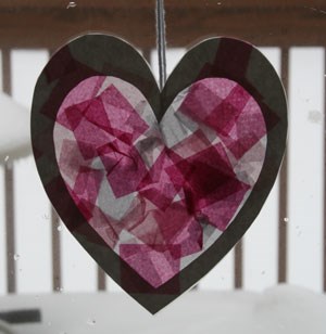 Stick the tissue paper onto the heart making sure to overlap the pieces. It's ok if the tissue paper goes over the edge of the template.