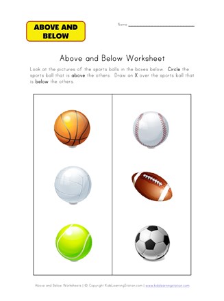 This sports themed above and below worksheet is simple and fun and will help kids practice their ability to recognize things that are above and below. They are asked to circle the sports ball that is above the others in each column and draw an X on the sports ball that is below the others. This makes a great kindergarten worksheet and is perfect for any age child that is just learning the concepts of above and below.