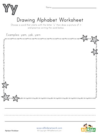 Awesome worksheet for kids learning the letter Y. Kids are instructed to think of something that starts with the letter "y" (ex. yam, yak, yarn), draw a picture of it, and then write the word on the line provided.