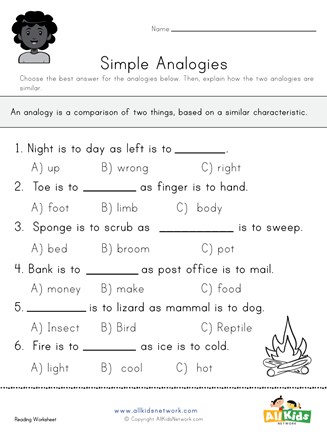 Strengthen vocabulary with this printable multiple choice analogies worksheet featuring opposites, part-to-whole, and classification relationships. Students select from 3 options for each of 6 analogies about body parts, tools, animal classifications, and temperature. Excellent for building logical thinking skills. Includes answer key.