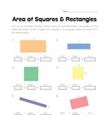 Great worksheet for kids to practice calculating the area of squares and rectangles.