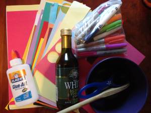 - Using the small bowl, measuring spoons, and wooden spoon, combine the white glue and vinegar. (see photos)