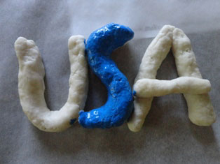 - Take another piece of play dough and roll into a straight line. Repeat with two more pieces. Take a fourth piece of play dough and form a smaller roll. Using the small roll and one long piece, form the letter "A." Using another line, create the letter "U." With the remaining line, create the letter "S." Join the letters together so that they form "USA." (see photo)