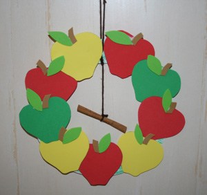 Spread an even layer of white glue around the paper plate ring. Stick your apples onto the ring. Then glue an stem and leaf onto each apple.
