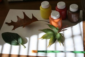 Make a leaf print on some scrap paper first to remove some of the paint and then print onto your real paper.