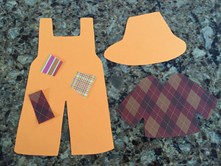 Using template, trace and cut clothes from both construction paper and scrapbook paper. Cut a few small squares and rectangles to use as patches on clothing.