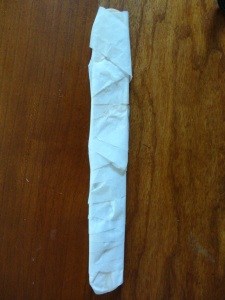 Using scissors, cut long, thin strips from the white tissue paper for the mummy wrappings. (see photos)