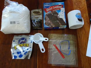 - Gather the three plastic bags and the coffee mug. Place the cake mix in the bottom of the mug, then put the frosting mix in next, and top with the decoration mix. Set aside for now. (see photo)