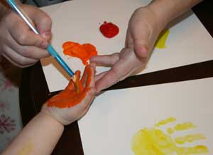 Our finger paint turkey craft is a twist on the typical handprint turkey craft that is usually done around Thanksgiving. We were looking for a craft that our three year old daughter could do pretty much independently, and the use of handprints is a wonderful added bonus! Our daughter loved getting her hands painted and making prints and loved experimenting with mixing the colors together exclaiming at one point that red and yellow really do make orange! This is a great Thanksgiving craft for the younger set that makes a wonderful homemade decoration to share with family and friends.
