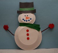 Cut a longer green strip out of construction paper and glue it over the junction of the large and small paper plates as the snowman's scarf.