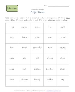 Students will enjoy the repetition as you continue through our second grade grammar series with these adjective worksheets. While the tasks become familiar, the concept has changed to words that describe nouns: adjectives! Students continue to identify adjectives, use them in sentences they write on their own, and to differentiate adjectives from other words. Make sure to check out the rest of our grammar worksheets.