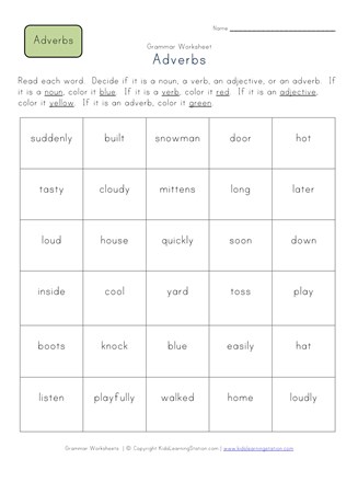 Color the Adverbs, Verbs and Nouns Worksheet