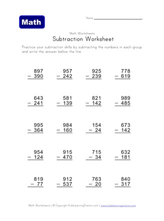 This subtraction worksheet is made up of three digit subtraction problems. Some include borrowing, including borrowing across zeros.