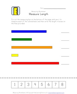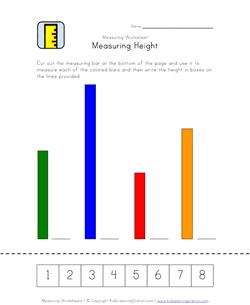 This collection of measuring worksheets asks kids to cut out the measuring bar at the bottom of the page and use it to measure the objects or colored bars and then to write the correct height or length measurement on the line provided.