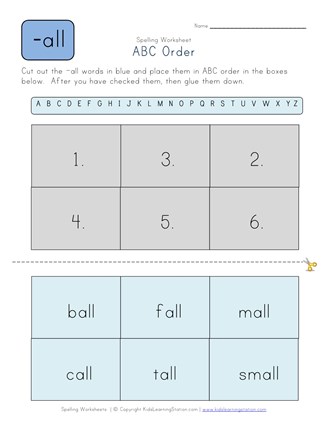Put each of the -all words in ABC order in this 1st grade spelling worksheet.