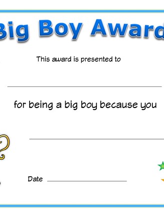 Reward a young boy for growing up and acting like a "Big Boy" with this printable certificate. Any young boy will feel very proud when they receive this special big boy award certificate and its a great way to reinforce the good behavior. The certificate has a blank area to fill in what he did that was like a big boy so it is customizable for your needs.