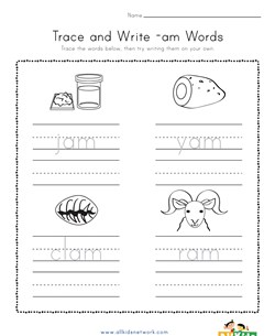 Check out our collection of -am word family worksheets that will help kids recognize and write words in the -am family like jam, clam, yam, ram, ham and more.