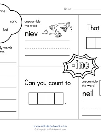 Identify the -ine words in the word cloud and complete each section of this word family worksheet including writing and unscrambling -ine words. This worksheet include the words fine, nine, mine, line and vine.