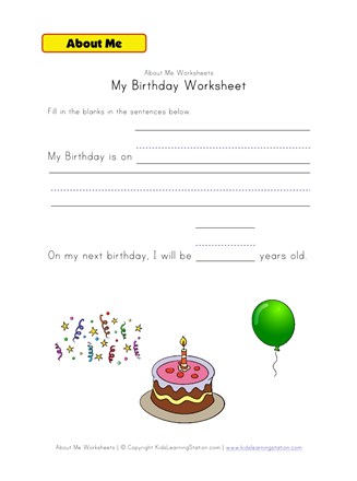 This birthday worksheet is part of our collection of "All About Me" worksheets which are perfect for preschool and kindergarten age children. This worksheet asks children to write the date of their birthday on the lines provided. Then they are asked to write how old they will be on their next birthday.