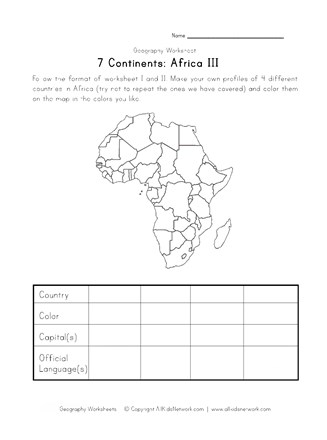 Follow the format of worksheet I and II. Make your own profiles of 4 different countries in Africa (try not to repeat the ones we have covered) and color them on the map in the colors you like.
