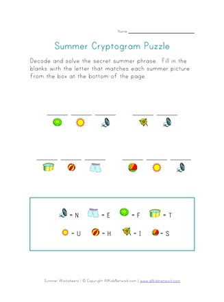 Check out our printable summer puzzle which is a picture cryptogram worksheet for kids. Children will have fun matching the summer pictures with the letters in the key and using it to solve the puzzle. Print this worksheet out and check out the rest of our summer worksheets. Also make sure to check out our section of summer crafts for kids.