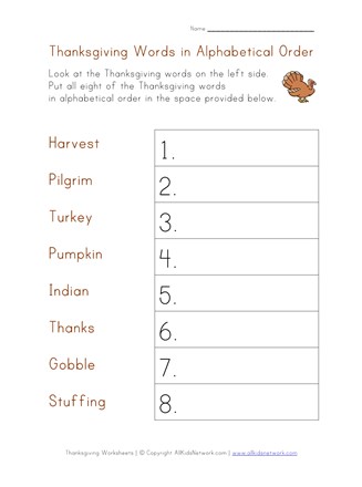 This Thanksgiving worksheet will help kids practice putting words in alphabetical order. Kids are asked to put the Thanksgiving related words on the page in alphabetical order in the numbered boxes provided. Print this worksheet out with the rest of our Thanksgiving worksheets to do with your kids!