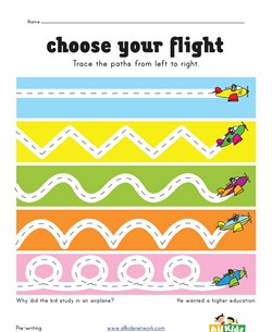 Kids will have fun developing their early writing skills with these fun worksheets. These pre writing worksheets get children to trace a variety of different types of lines on beautifully drawn pictures. Help the bee visit the flowers, the snow and rain fall, the airplanes fly and much more.