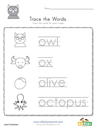 Children will have fun while practicing their handwriting skills by tracing all the letter O words including owl, ox, olive and octopus.